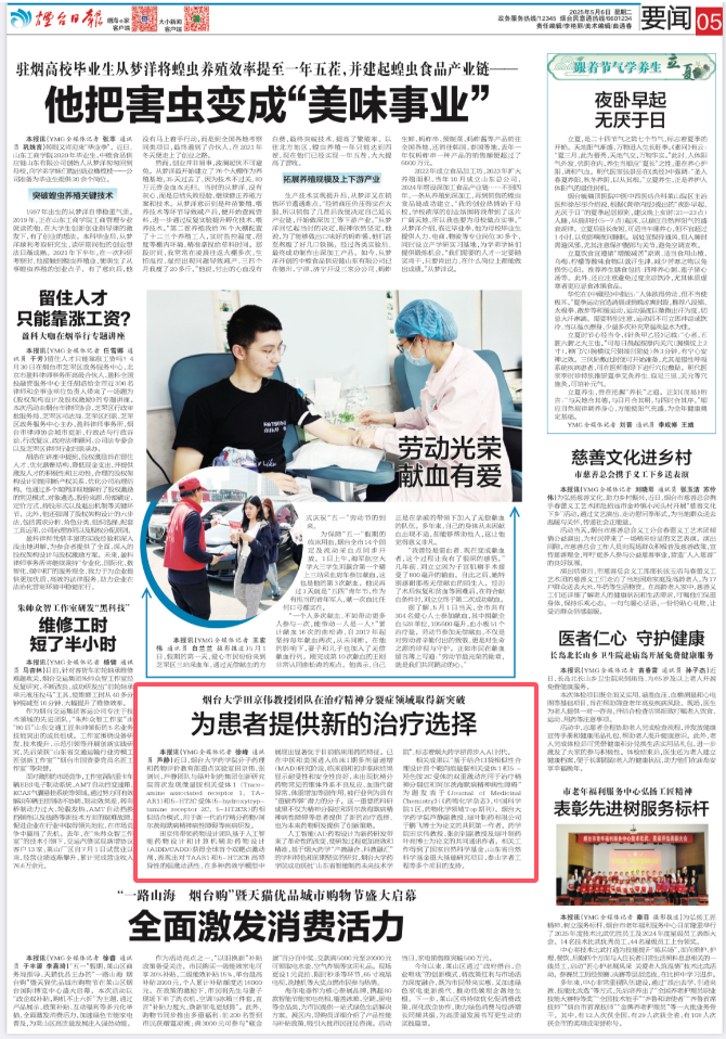 《煙臺日報》5月6日要聞版刊發《煙臺大學田京偉教授團隊在治療精神分裂癥領域取得新突破》