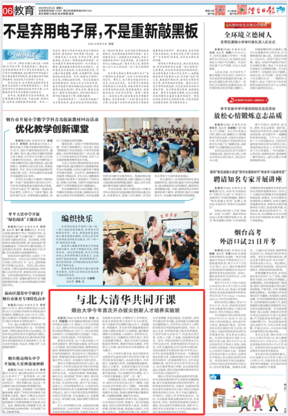 《煙臺日報》教育版6月4日刊登《煙臺大學今年首次開辦拔尖創新人才培養實驗班》