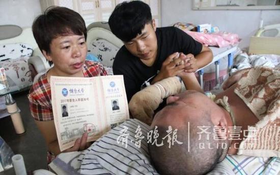 18歲的準大學生沈博瑞今年高考以525分的成績被煙臺大學化學工程與工藝專業錄取。這本應是一件讓全家人歡欣鼓舞的事情,沈博瑞一家卻高興不起來。去年11月父親沈國輝患腦梗花費十余萬元,除了家中的幾萬積蓄,大部是親戚朋友湊的。現在父親全身癱瘓,并伴隨多器官功能衰竭,失去語言能力,臥病在床靠藥物維持,每日需服用三四百元的藥物。母親要照顧父親,不能再外出工作,家里一畝農田也僅能解決口糧問題。暑假期間,沈博瑞去餐廳刷盤子、去建筑工地搬磚,賺來的微薄收入連父親的醫藥費都不夠。拿到錄取通知書,年少的沈博瑞猶豫了。他上大學父親怎么辦?他想為瘦弱的母親分擔家庭壓力,也為父親賺一部分醫藥費。躺在病床上一動不能動的沈國輝為孩子高興,也為孩子的抉擇愧疚,但全身乃至面部的麻痹讓他連大哭一場的能力都沒有。