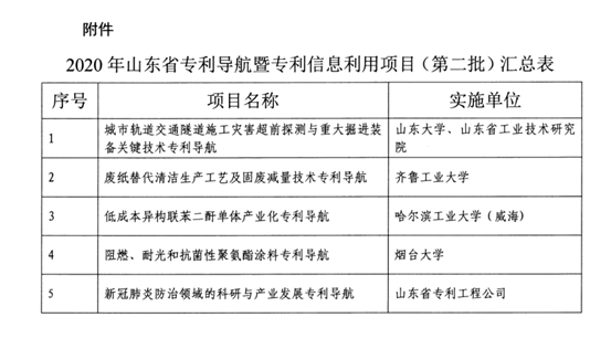 近日,山東省知識產權事業發展中心公布《關于確定2020年度第二批專利導航暨專利信息利用項目的通知》,我校承擔的“阻燃、耐光、抗菌性聚氨酯涂料專利導航”項目獲批立項,支持經費20萬元。該項目前期曾獲煙臺市專利導航項目支持,該導航項目前期研究成果授權的職務專利已獲得第三屆(2020)山東省專利三等獎,其授權的外圍職務專利獲得2019年第二十一屆中國專利優秀獎。