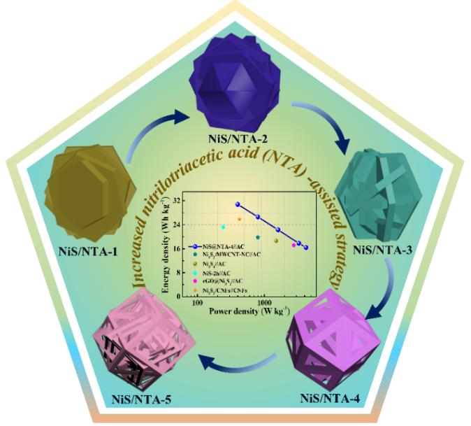 該團隊提出了一種次氮基三乙酸(NTA)輔助水熱制備金屬硫化物電極材料的創新策略。該策略巧妙利用了NTA的絡合作用,在實現碳材料和NiS的牢固結合的同時,有效調控了復合材料單元結構的微觀形態,其形貌演變如圖1所示。得益于分層組裝模式和穩定鍵合的協同作用,優化后的NiS/碳電極(NiS/NTA-2)在1.0 A g-1下具有1530.4 F g-1的優異比電容和5000次循環后85.6%的出色循環穩定性。所構建的NiS/NTA-2//AC混合超級電容器具有高達35.1 Wh kg-1的能量密度。該策略利用金屬絡合物獨特的化學性質,顯著提升了超級電容器的儲能效果,為相關研究提供了新思路。(論文鏈接:https://doi.org/10.1016/j.cej.2021.133673