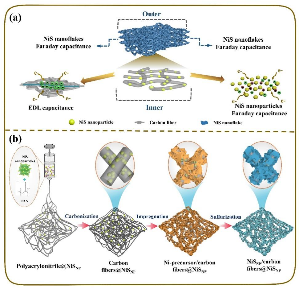 此外,該團隊創新性地提出了一種新穎且可擴展的“內外協同”策略來全面提升超級電容器的電化學性能。通過該策略將尺寸均勻的NiS納米顆粒通過靜電紡絲技術封裝在碳纖維的內部區域作為氧化還原活性劑,不但賦予電極法拉第電容,而且有效地避免了納米顆粒的聚集。同時,均勻分布的NiS納米片通過浸漬-硫化過程牢固地嵌入在碳纖維的外表面,顯著擴大了離子擴散區域,并緩解了體積膨脹,如圖3所示。特殊的結構設計使NiSNF/CF@NiSNP-3電極在1.0 A g-1下具有高達1691.1 F g-1的比電容。組裝的NiSNF/CF@NiSNP-3//AC混合超級電容器的最大能量密度和功率密度高達31.2 Wh kg-1和4004.3 W kg-1。這種“內外結構同時利用”的設計為增強纖維類電極材料的儲能效果提供了有吸引力和指導性的見解,并且可以被擴展應用到各類能源材料系統之中。(論文鏈接:https://doi.org/10.1016/j.cej.2022.137262