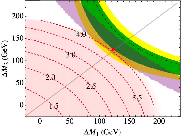 圖:解釋W-玻色子質量反常(黃色與綠色區域)、暗物質(紫色區域)、電弱相變(紅色區域)的可行參數空間。