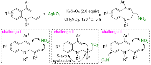 N-雜環化合物是合成和醫藥化學中常見的分子骨架,并且是非常有價值的合成前體,可以進一步轉化為一系列有價值的結構單元。此外,在世界銷售排名前100的藥物分子中,含氮雜環占比接近一半。因此,N-雜環的有效構建一直是有機合成研究的熱門領域。目前,采用硝基自由基誘導的加成環化制備含硝基7元氮?的方法尚無報道。近日,我?;瘜W化工學院有機方法學團隊,孫凱課題組利用自由基串聯環化策略,成功實現了7元氮雜環的構建工作,制備了系列結構多樣性的7元氮雜環(Chem. Commun., 2022,DOI:10.1039/D2CC02688K)。