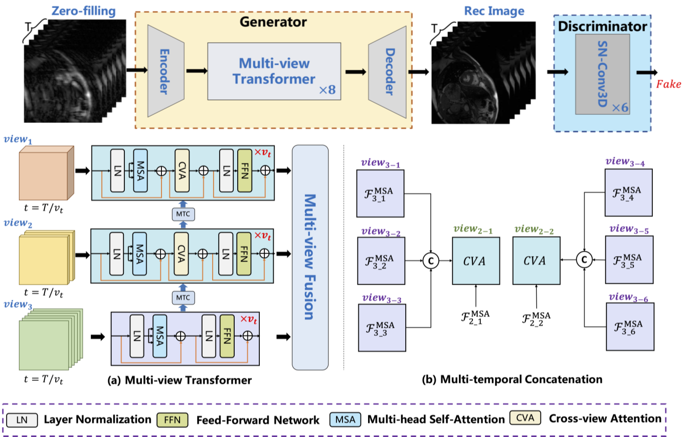 該論文提出了一種關注心臟重建的基于區域聚焦多視圖Transformer的生成對抗網絡。多視圖Transformer將連續的心臟幀分成多個視圖進行跨視圖特征提取,在特征之間建立長距離的依賴關系,從而有效地學習時空信息。該論文進一步設計了一個用于時空信息融合的跨視圖注意力機制,確保每個視圖中不同時空信息的相互作用,并捕捉到更多的心臟運動的時間相關性。此外,論文還引入了一個心臟區域檢測損失,以提高心臟區域的重建質量。