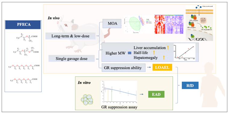 全氟和多氟烷基物質(PFAS)是一類應用極廣泛的化學物質,其生物蓄積性和潛在的健康危害屬全世界范圍內廣受關注的科學問題。PFECA被認為是傳統PFAS的新型替代品,具有好的推廣應用前景,但當前科學界對PFECA的體內藥物代謝動力學(PK)規律和健康風險的認識非常有限。在本工作中,研究人員發現分子量是決定不同PFECA化合物血清半衰期的關鍵因素。PFECA除了具有過氧化物酶體增殖物激活受體(PPAR)激動效應,導致β-氧化增強、脂肪酸降低等代謝改變外;長期低劑量PFECA暴露動物的肝臟細胞應激信號受到廣泛抑制,進一步的分子機制探究發現PFECA主要通過增強糖皮質激素受體(GR)的降解抑制了該信號途徑,進而廣泛損害下游的應激信號,這一效應在傳統PFAS中未見報道。研究人員進而通過PK與體外體內外推(IVIVE)模型相結合,比較了PFECA動物暴露與體外細胞檢測中GR抑制效應的基準劑量(BMD),提出了基于GR抑制效應的PFECA參考劑量(RfD)。