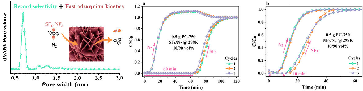 煙臺大學徐秀峰教授課題組較早開展了SF6、NF3等新型溫室氣體的減排研究,利用化學分解方法(催化水解或無水分解)將這些氣體轉化為低害物質。相比之下,將SF6、NF3從工業廢氣中吸附分離并回收再利用是一種更有效的資源化處理方法。為此,本課題組以檸檬酸鉀為原料,經一步碳化活化,調控納米片狀炭基吸附劑的孔結構和表面性質,增強了吸附劑與SF6、NF3分子的相互作用,提高了吸附劑在常溫常壓下對SF6的吸附量(4.09 mmol·g-1)和吸附選擇性(10%SF6/90%N2的分離比436.4),對10%NF3/90%N2的分離比達到61.4,優于文獻報道的吸附劑。研究結果以“Highly-efficient separation of SF6/N2and NF3/N2with record selectivity on one-step synthesized carbon nanosheet”為題,發表在化工分離領域權威期刊《Separation and Purification Technology》。作為資源化減排SF6、NF3廢氣的一種有效方法,該工作豐富了對吸附分離含氟溫室氣體科學規律的認識。