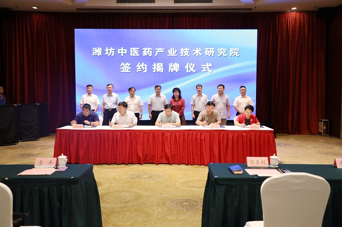 8月21日上午,濰坊市寒亭區人民政府、煙臺大學、濰坊華英生物科技有限公司、濰坊市科學技術局、濰坊市衛生健康委員會合作共建濰坊中醫藥產業技術研究院簽約及揭牌儀式在濰坊市寒亭區舉行。煙臺大學校長郭善利、副校長李合亮,濰坊市副市長李平,寒亭區委書記、濰坊經濟開發區(農綜區核心區)黨工委書記滕雙興出席簽約儀式。