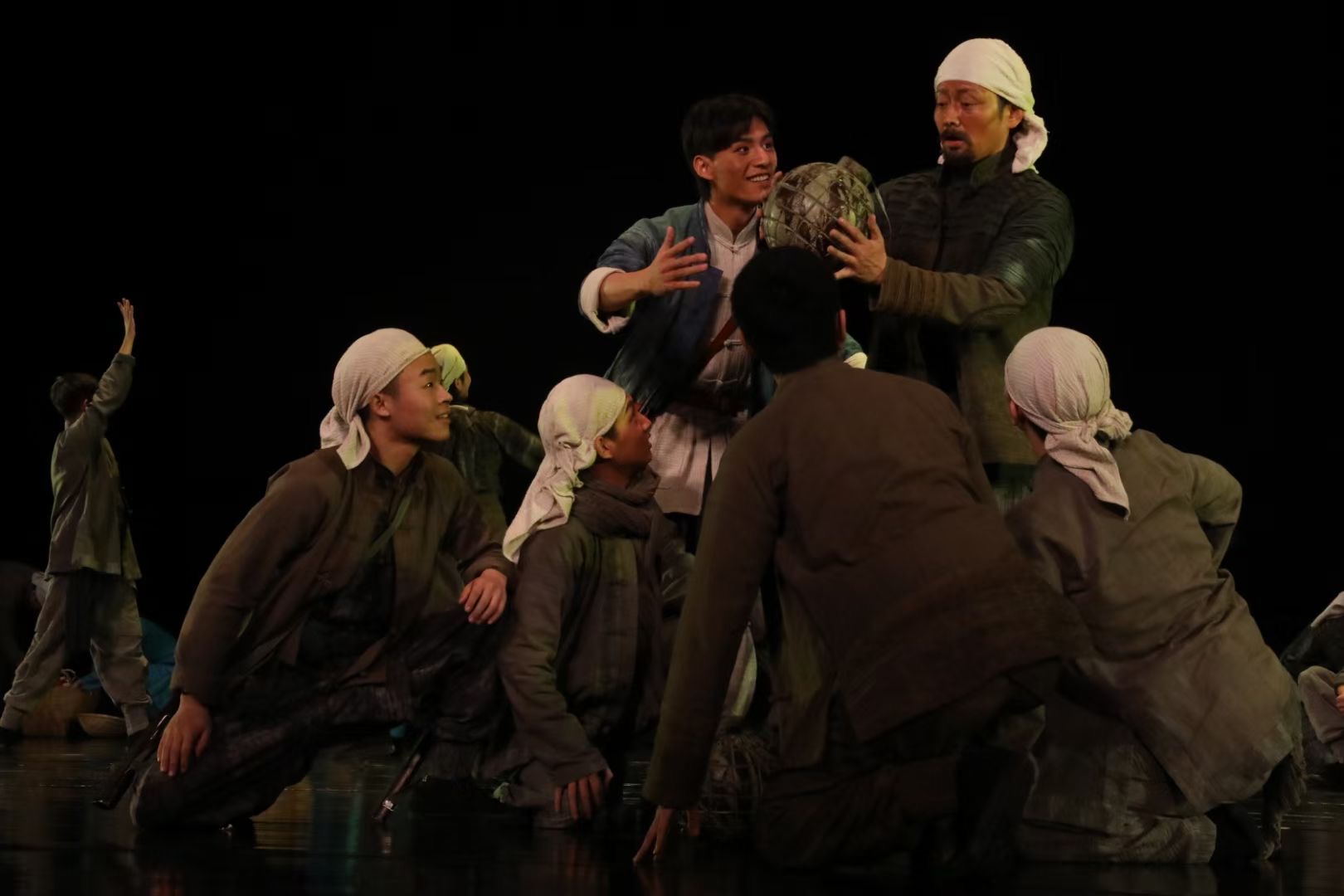 本場演出分為上下半場,上半場為原創舞劇《地雷戰》,由煙臺大學音樂舞蹈學院師生主創及演出。該劇通過海陽大秧歌等多種音樂舞蹈表達形式,生動展現了地雷戰這段耳熟能詳的膠東抗戰故事,深情謳歌了膠東兒女英勇無畏的愛國主義精神。隨著劇情的發展,音樂與舞蹈演員的表演時而舒緩深情、時而緊張刺激,時而輕松詼諧、時而磅礴大氣,讓臺下觀眾的心緒重新回到那段激情燃燒的歲月。