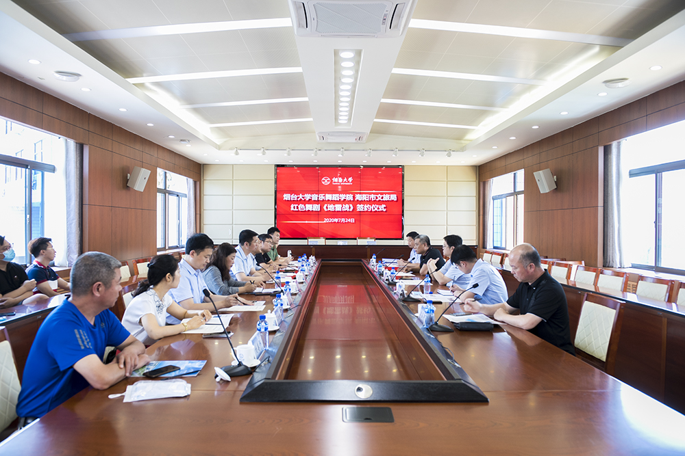 7月24日,煙臺大學音樂舞蹈學院與海陽市文旅局舉辦紅色舞劇《地雷戰》簽約儀式,海陽市委常委、組織部長楊濤,海陽市文旅局局長趙中國、副局長李晶濤,煙臺大學黨委常委王澤光、于秀國,服務地方辦公室、社科(科技)處、音樂舞蹈學院相關負責人和部分教師代表參加簽約儀式。