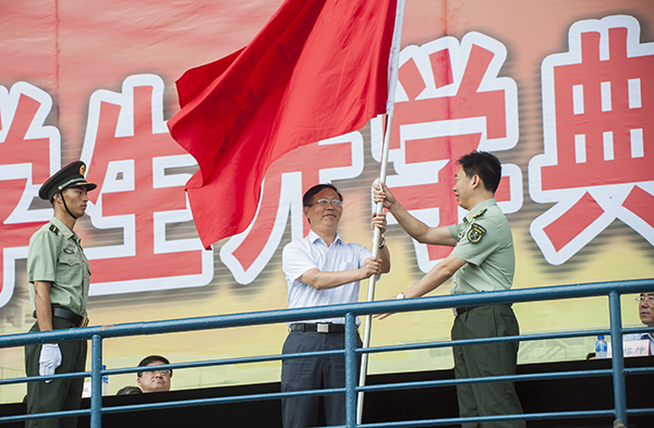 典禮上,黨委書記崔明德向2014級學生軍訓團副團長、山東省軍區駐煙臺大學選培辦副主任王春雷授軍訓團團旗。